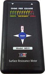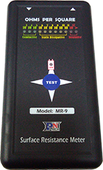 表面阻抗測試器MR-9,符合ASTMD-257標準,只需使用一顆9V鹼性電池以本機背面平行電極感測方式即可量測導電體、靜電逸散、絕緣體之表面電阻率,另連接接地線以量測接地阻值或使用迷你測試夾測量體積阻抗。